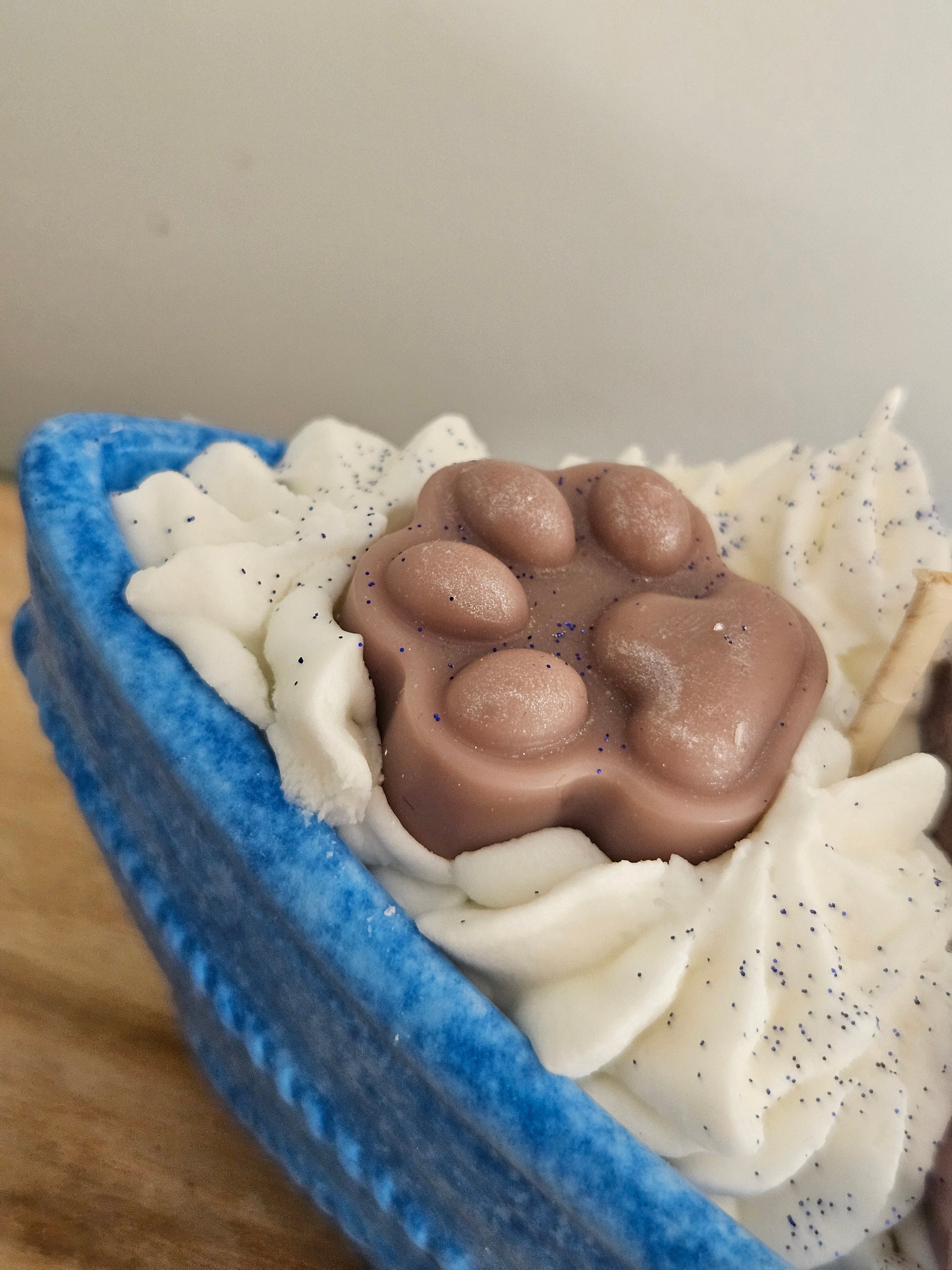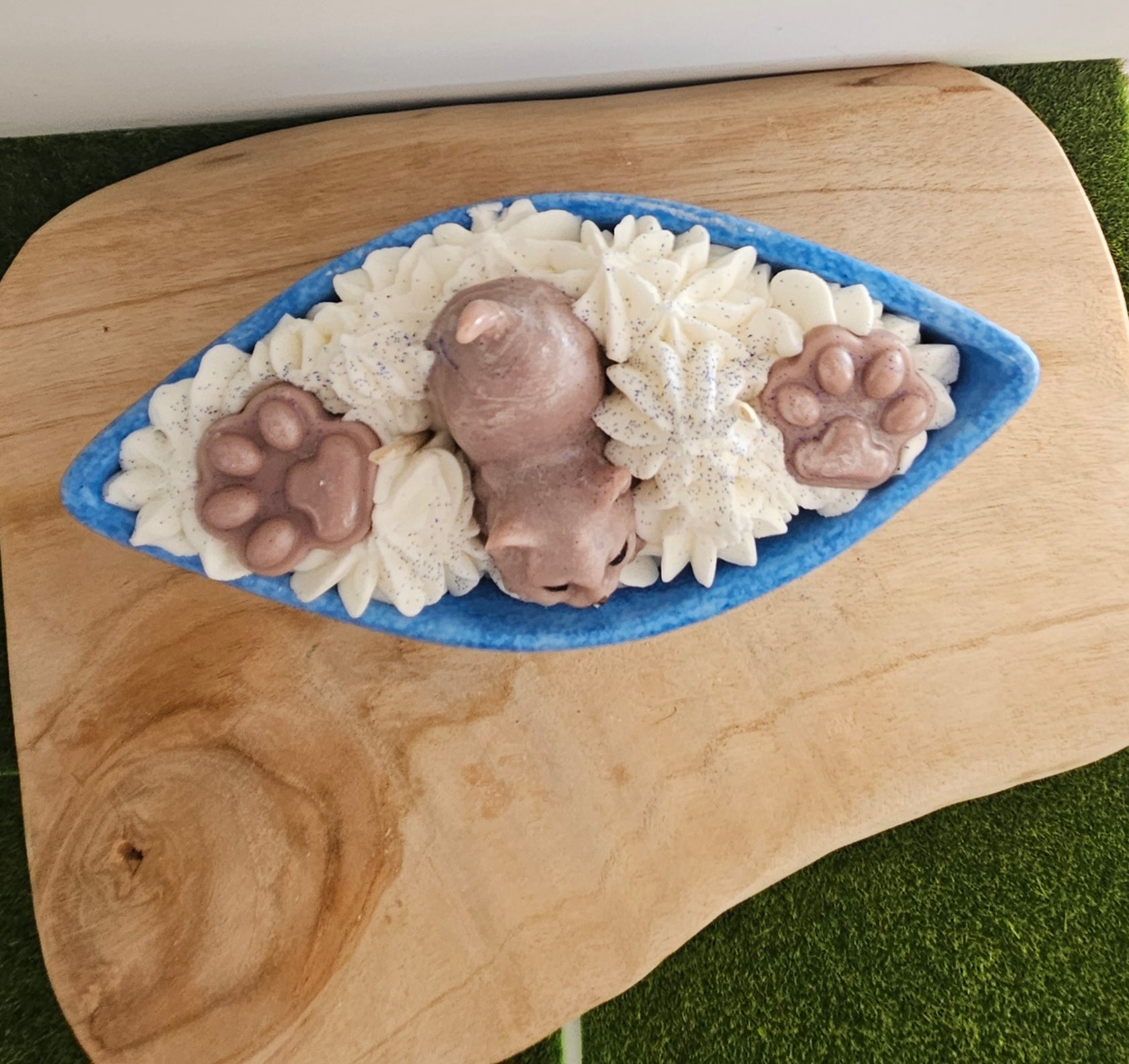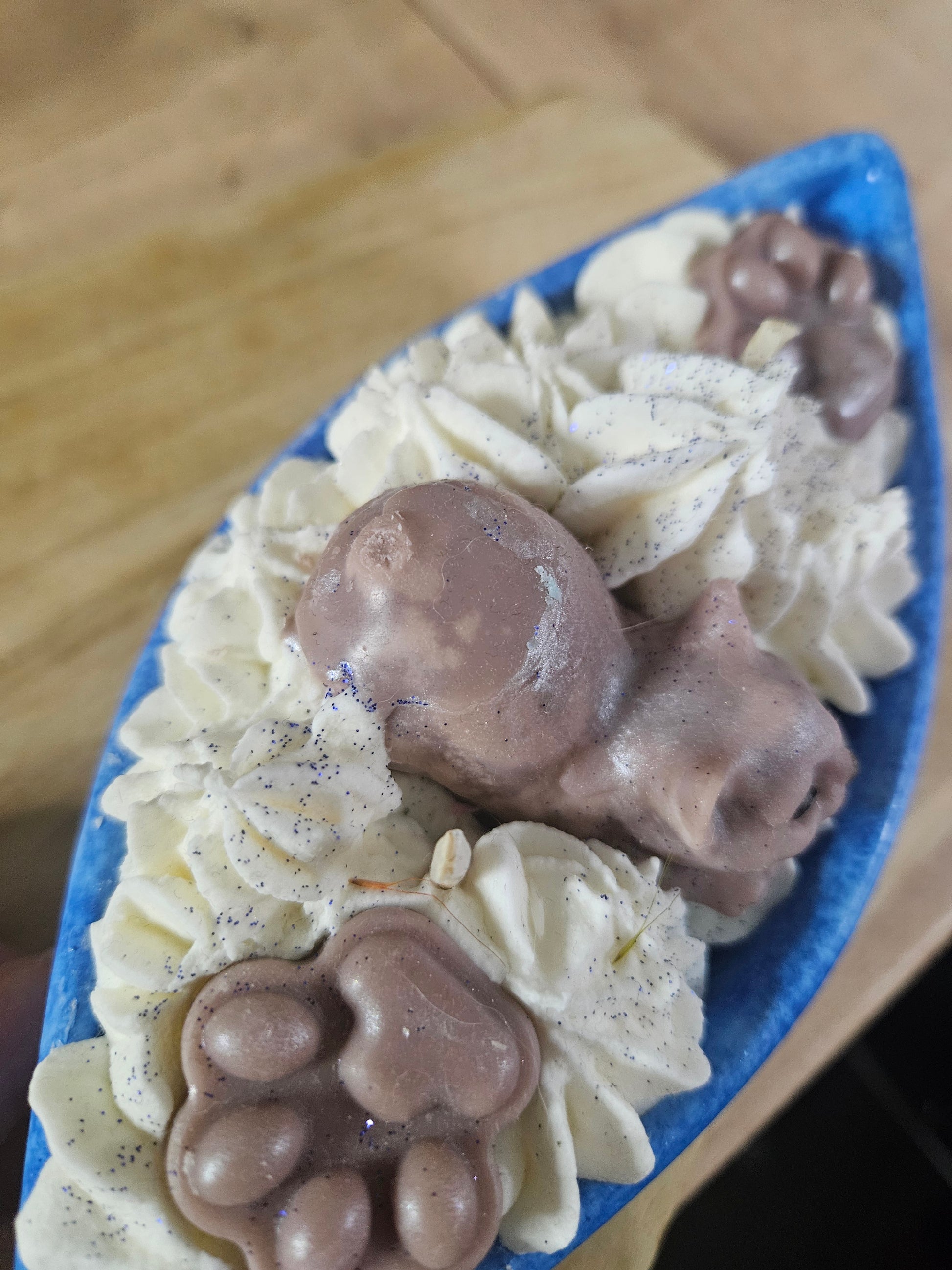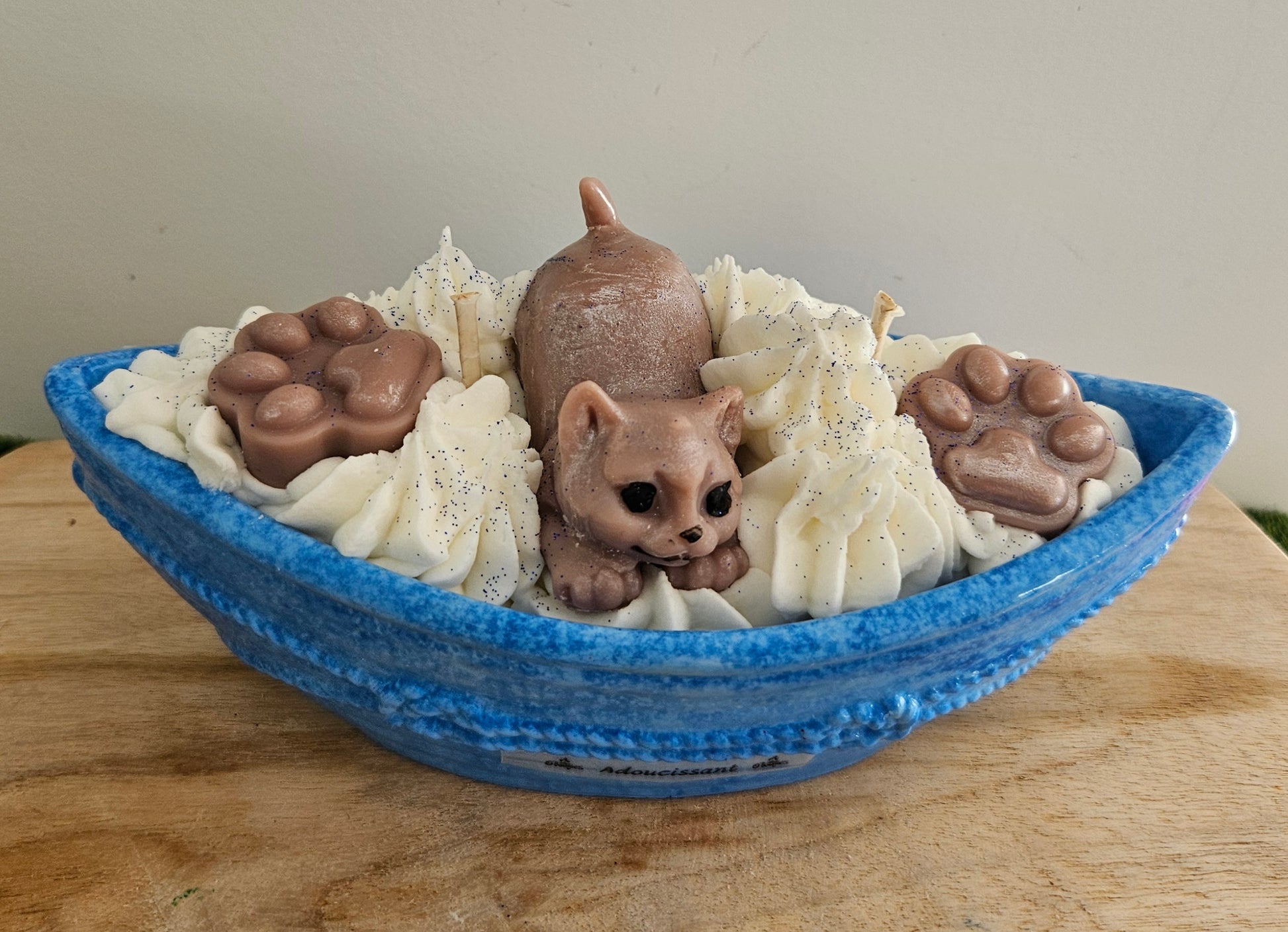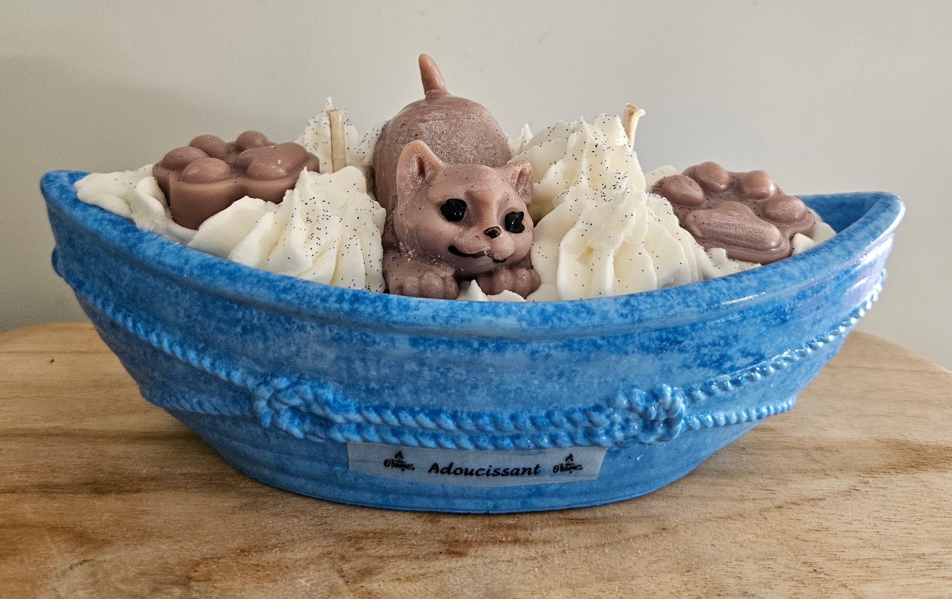 Bougie gourmande senteur adoucissant représentant un chat posé dans un bateau réalisé en aqua résine.