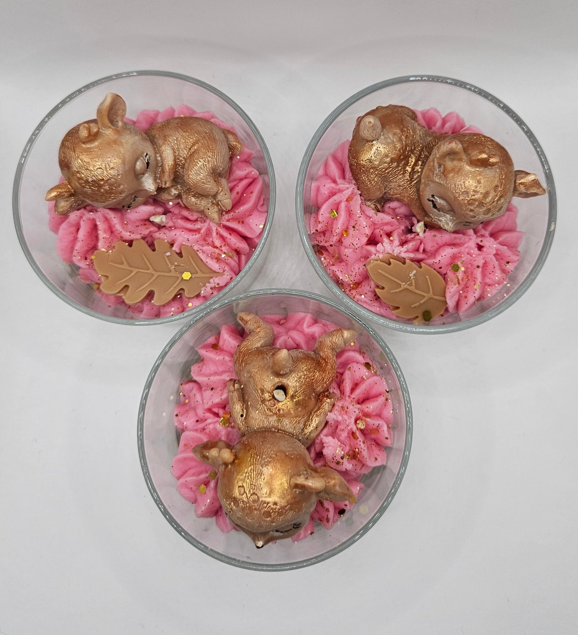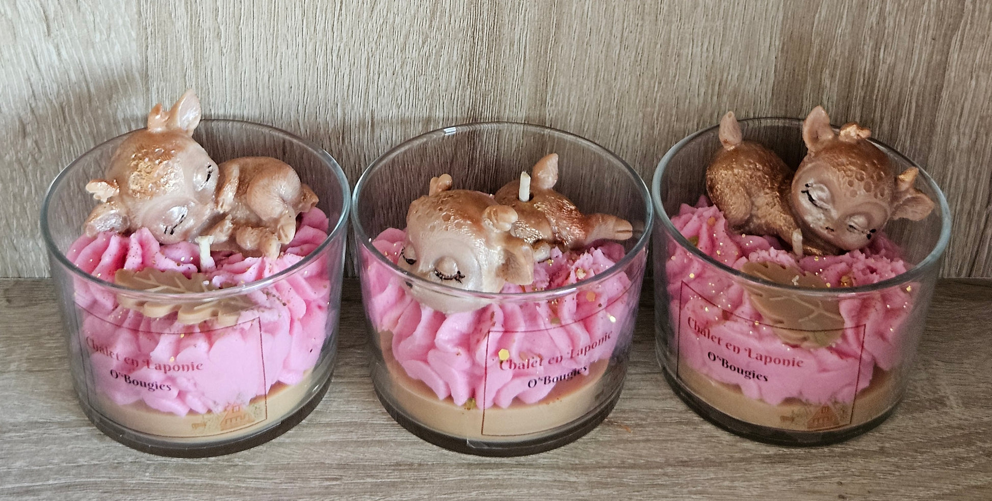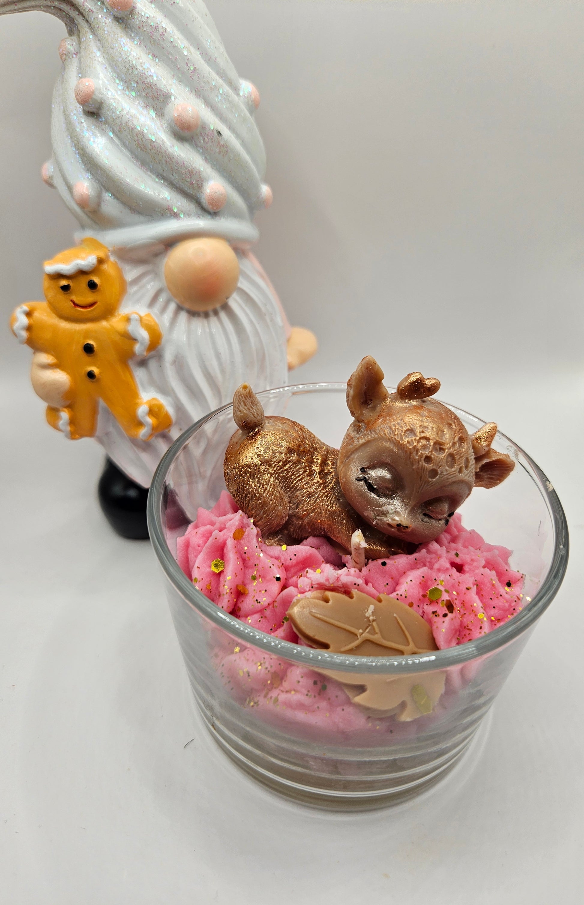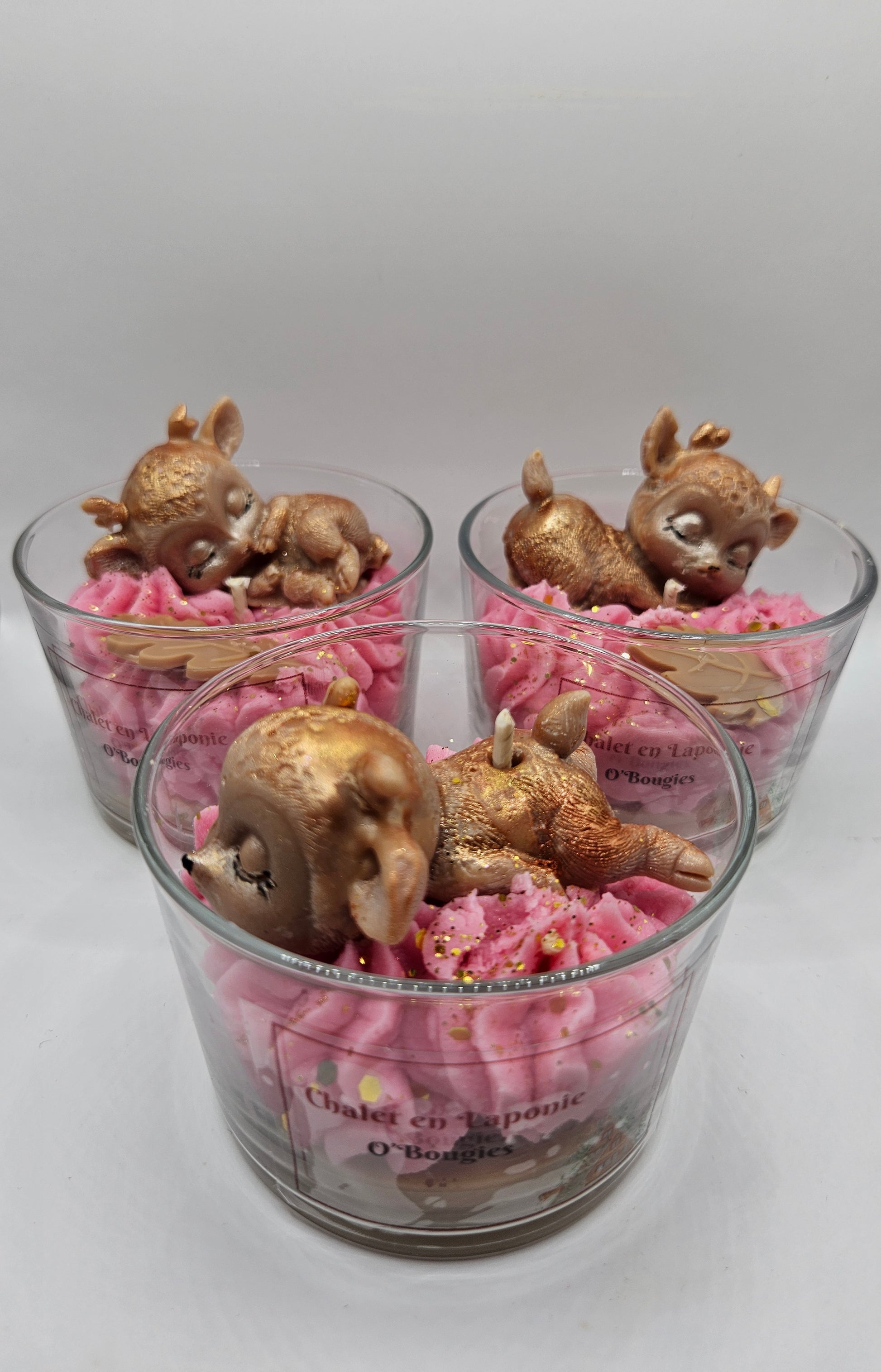 Un design féerique, une senteur chaleureuse, et une ambiance cocooning assurée, associé à un design unique, orné d’un petit faon endormi sur une crème de cire rose poudré.