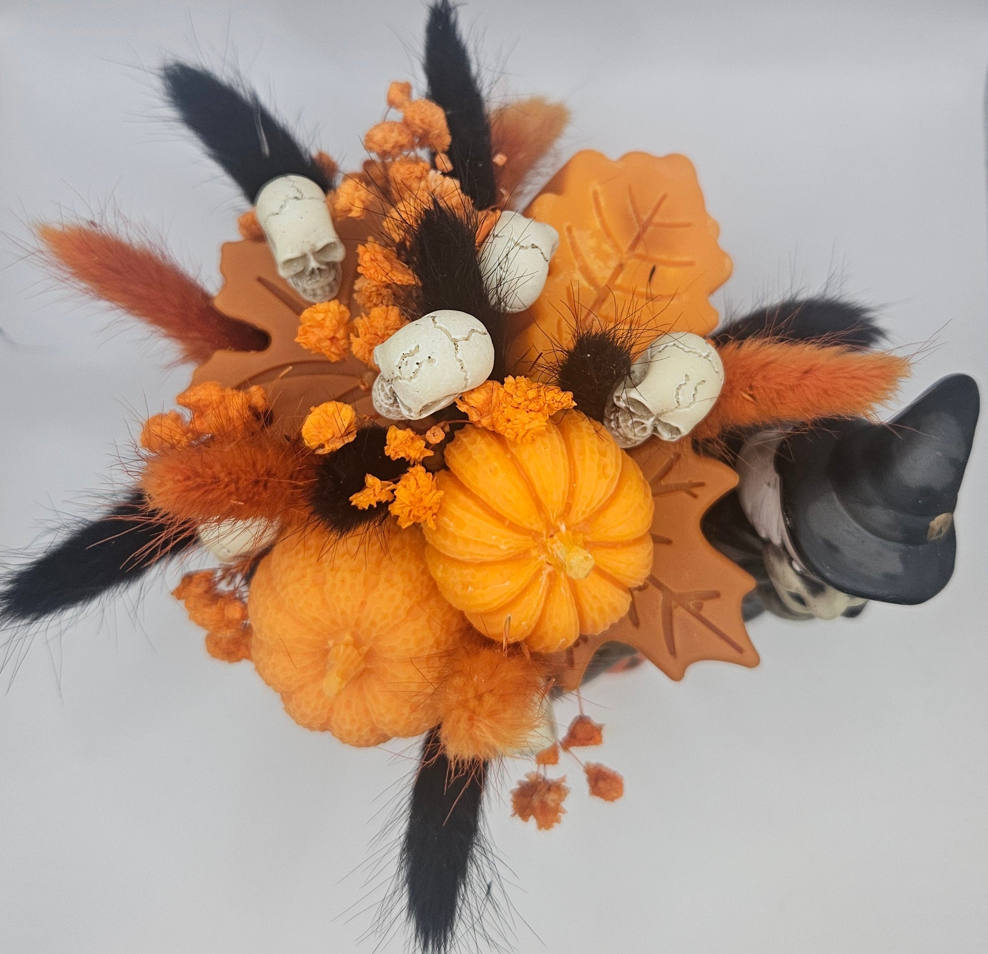Installée dans un chaudron décoré d’une petite sorcière, elle mélange fleurs séchées, mini citrouilles et crânes pour une ambiance Halloween unique.